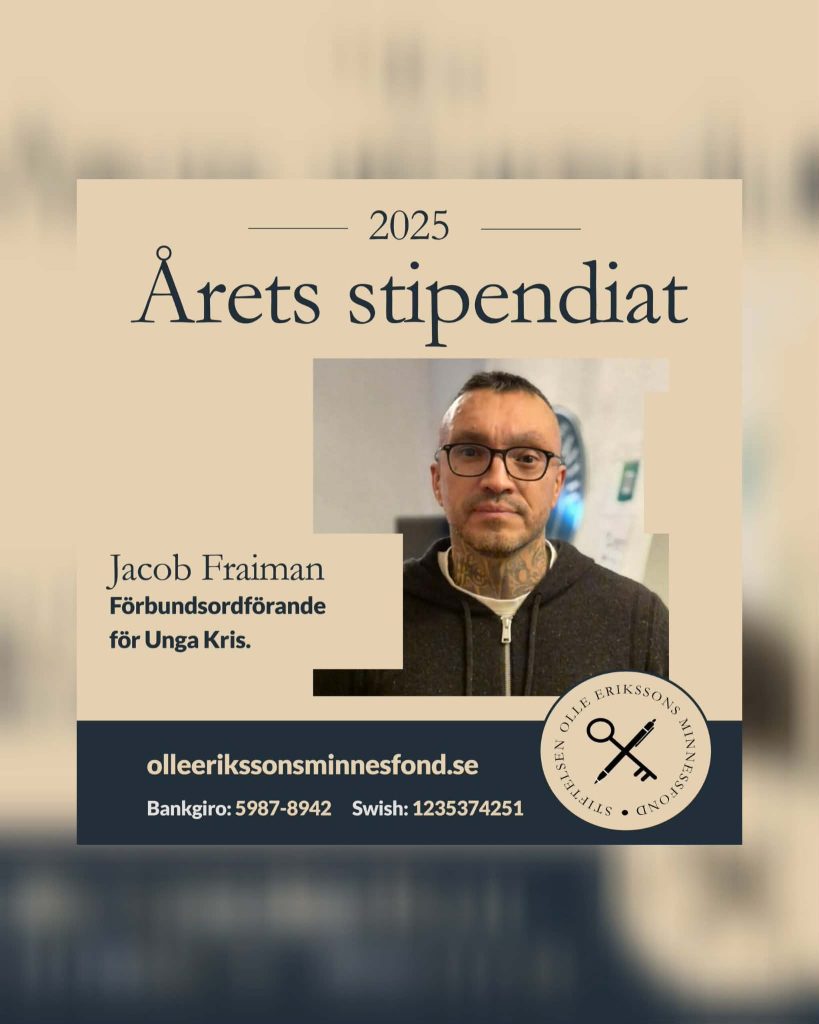 Styrelsens motivering: 2025 års stipendium till Olle Erikssons minne tilldelas Jacob Fraiman, för hans mångåriga arbete med att mänskliggöra unga i kriminalitet och vara en röst för en brottsbekämpning med humanistiska förtecken.